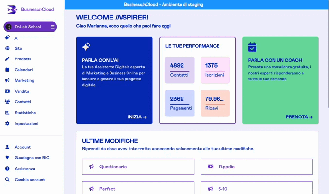 Per prima cosa accedi alla tua dashboard di BusinessinCloud.