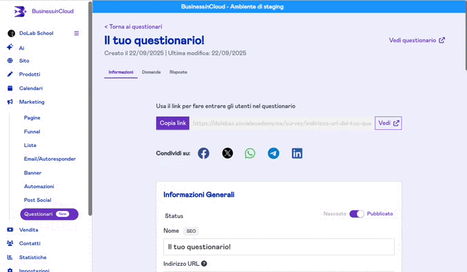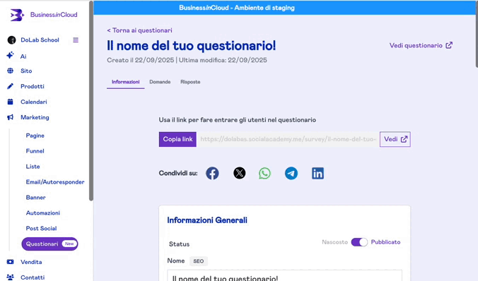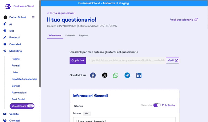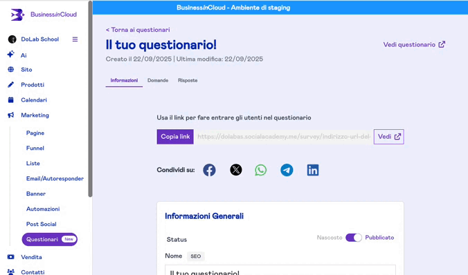 Se pubblicato, il questionario sarà raggiungibile e potrai condividerlo immediatamente.