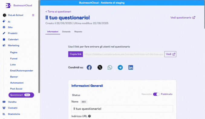 Ora che hai creato le domande e il tuo questionario è attivo, sei pronto a raccogliere i dati forniti dai tuoi utenti. Questa è la parte più gratificante: vedere le risposte arrivare e trasformarle in informazioni utili per il tuo business.