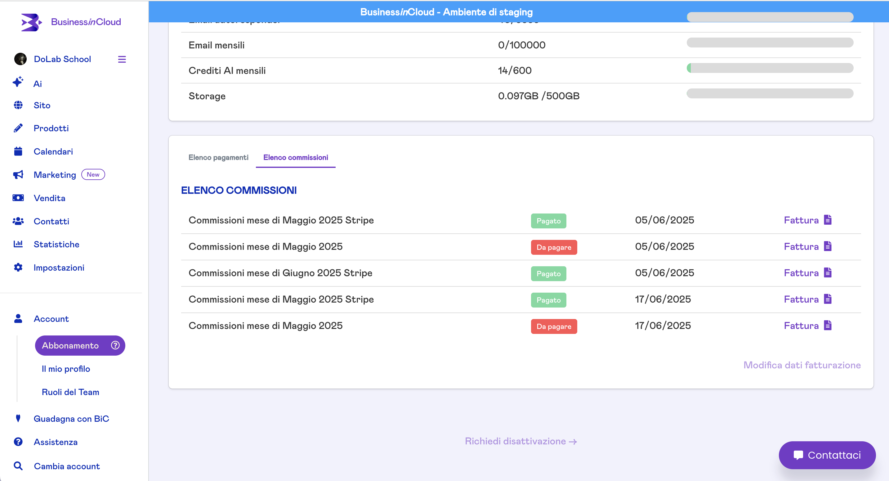 Potrai sempre consultare Fatture delle fee da saldare sarà disponibile a inizio del mese nella tua area "Account" > "Abbonamento”, sotto la voce "Elenco Commissioni". Le fatture che non hai ancora saldato avrano l'etichetta "Da pagare" in rosso, cliccandoci sopra verrà riportato al link della pagina di pagamento.